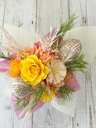 ミモザイエローやシャーベットオレンジのお花を見ると本当に元気が出ます。